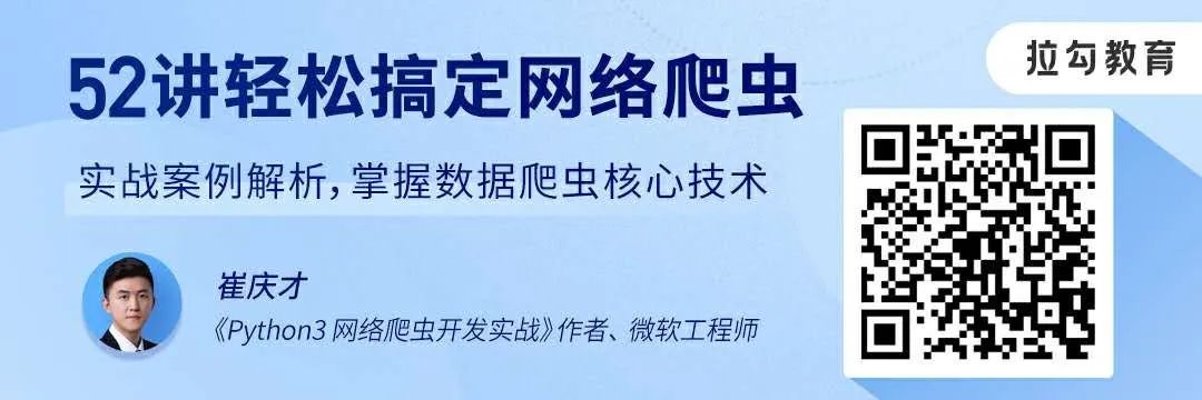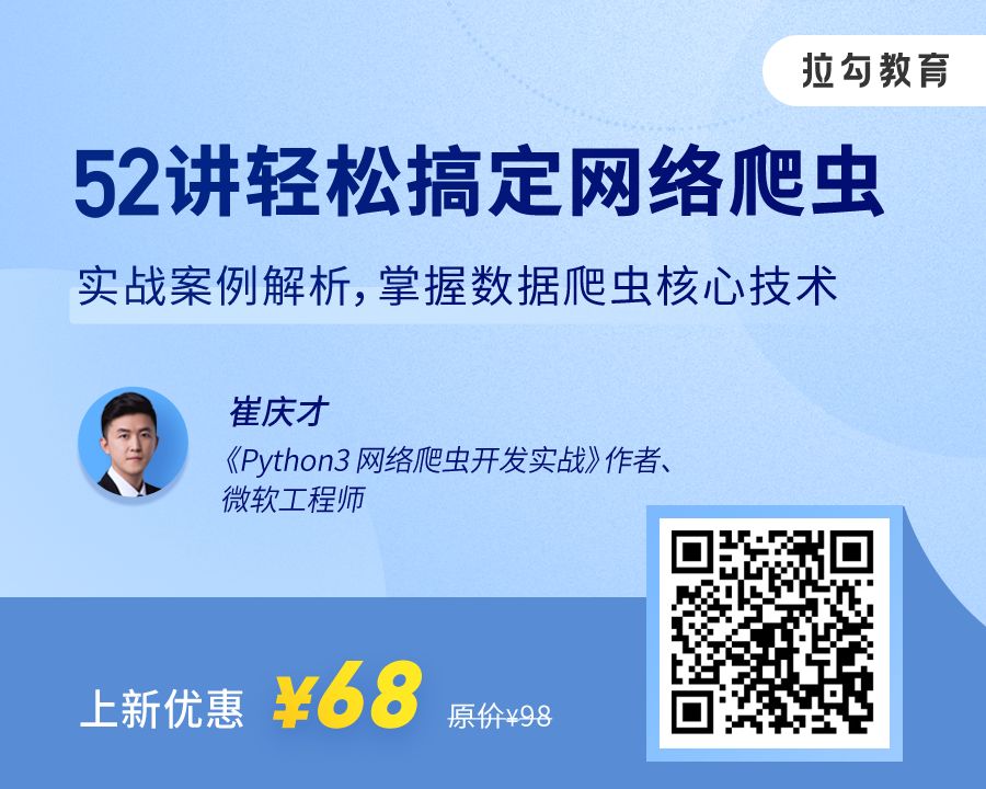 为了解决这样的问题,他和拉勾旗下的拉勾教育,联合推出了一门适合“新时代”的爬虫实战专栏「 52讲轻松搞定网络爬虫 」。这个专栏把他这本畅销书的知识点做了精简,选择那些你必须要学且学了就能用的知识点,结合当下的技术情况新增了很多关键内容,比如「 JavaScript 逆向 」「 App 逆向解密 」「 深度学习识别验证码 」「 网页的智能解析 」「 异步爬取 」。这些内容,你在市面上很难找到相应的学习资料的内容!