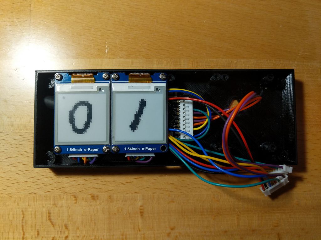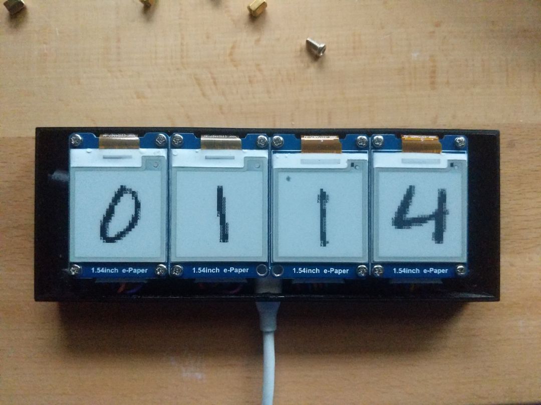 这样的电子钟只需要简单的电路板再加上 4 块电子墨水屏就行了,它背后的样子是这样的: