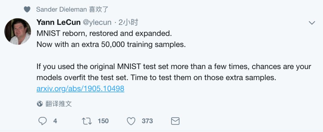 去年 6 月份,NYU 和 Facebook 的研究者重建并扩展了 MNIST 数据集,在测试集中新增了 50000 个样本,将测试集增加到 6 万样本。MNIST 作者之一的 Yann LeCun 表示,「如果多次使用原版的 MNIST 测试集,你的模型可能在测试集上已经过拟合了,是时候在新增的样本上试一下了。」
