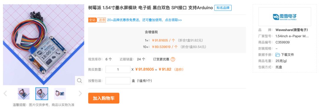 其次,一块 e-ink 屏大概 24 美元,虽然淘宝找不到,但是国内的元器件商城要便宜得多,一块只需要 92 元左右,可能树莓派对它的需求比较大吧。