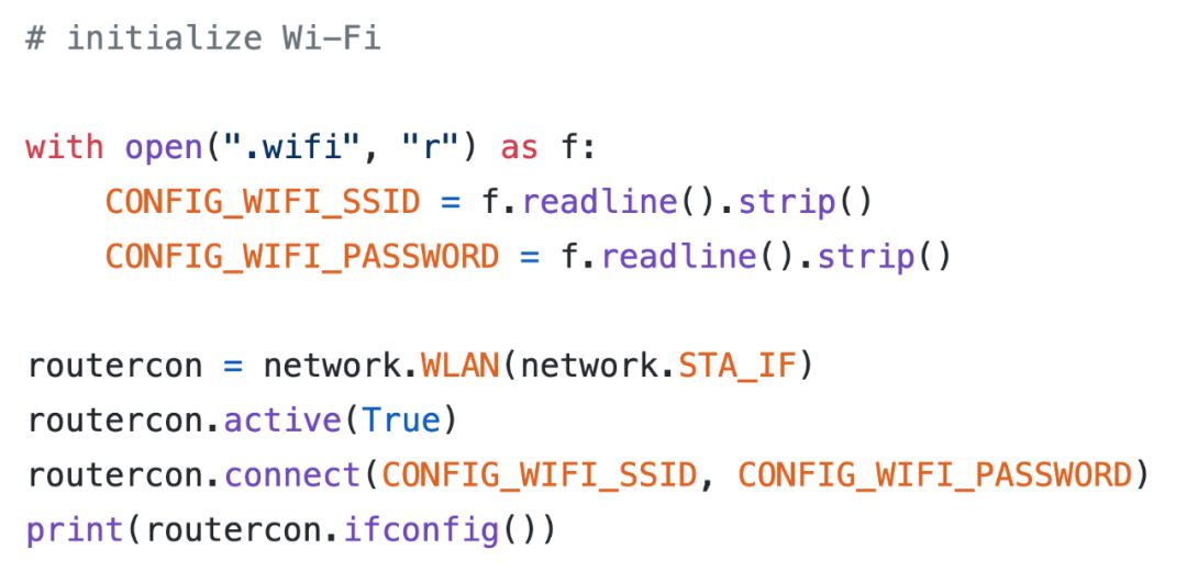 另外,我们还需要为 Wi-Fi 创建一个名为.wifi 的文件,中间写上 yourssid 与 yourpassword,具体的读取 WIFI 设置的代码就如下所示。
