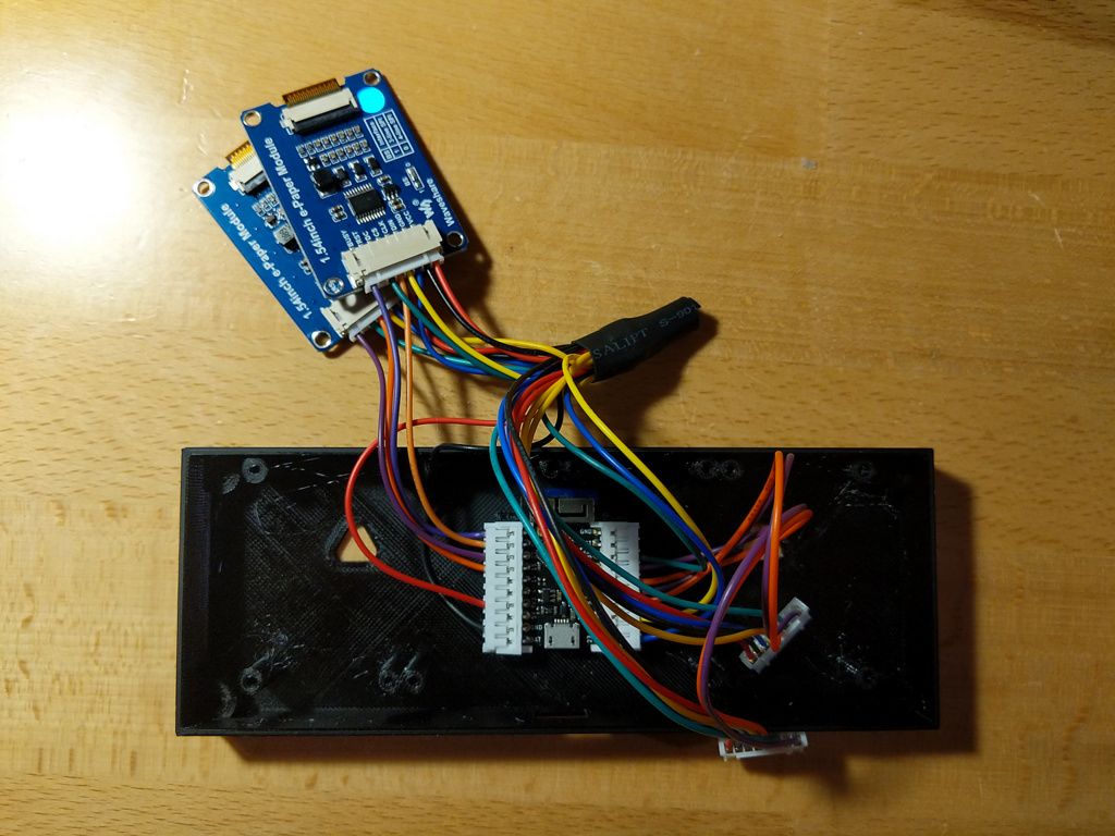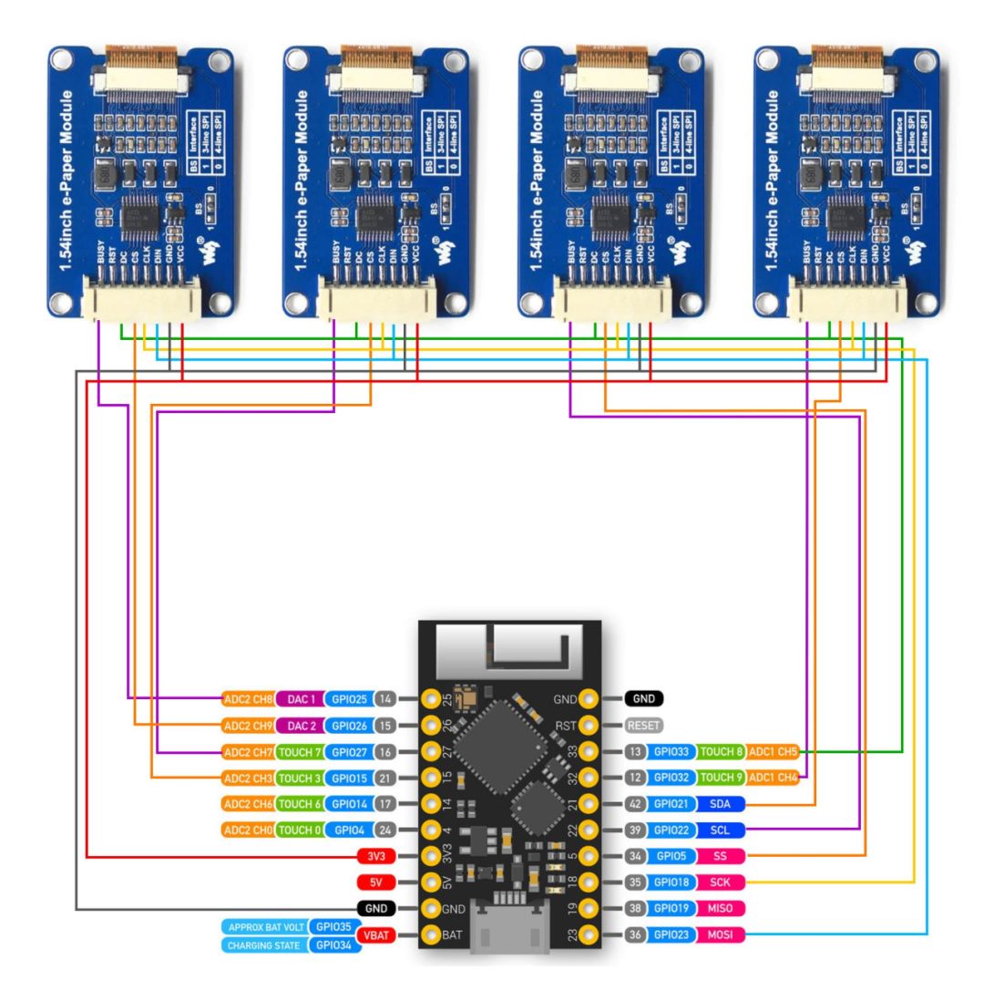 项目使用了 TinyPICO 开发板;紧凑的 ESP32 板以及大量的 GPIO 插脚、4MB 闪存、Wi-Fi,以及其他很多功能。TinyPICO 可以说是目前世界上基于 ESP32-PICO-D4 体积最小的开发板,240 MHz 的 32 位双核处理器足够我们完成计算。4 块 e-link 数字显示器,之所以选择 e-link,是因为它符合手写数字的概念,在任何光线条件下都能正常运行,而且也不至于打扰到任何人。Waveshare 的 e-link 显示屏大部分是 SPI,虽然也有些额外的引脚。大部分人会希望一块只包含 SPI 以及一块 CS 插脚,但多一些的链接器是有必要的。下面是 ESP32 的连接图,根据这个把电线卷起来。