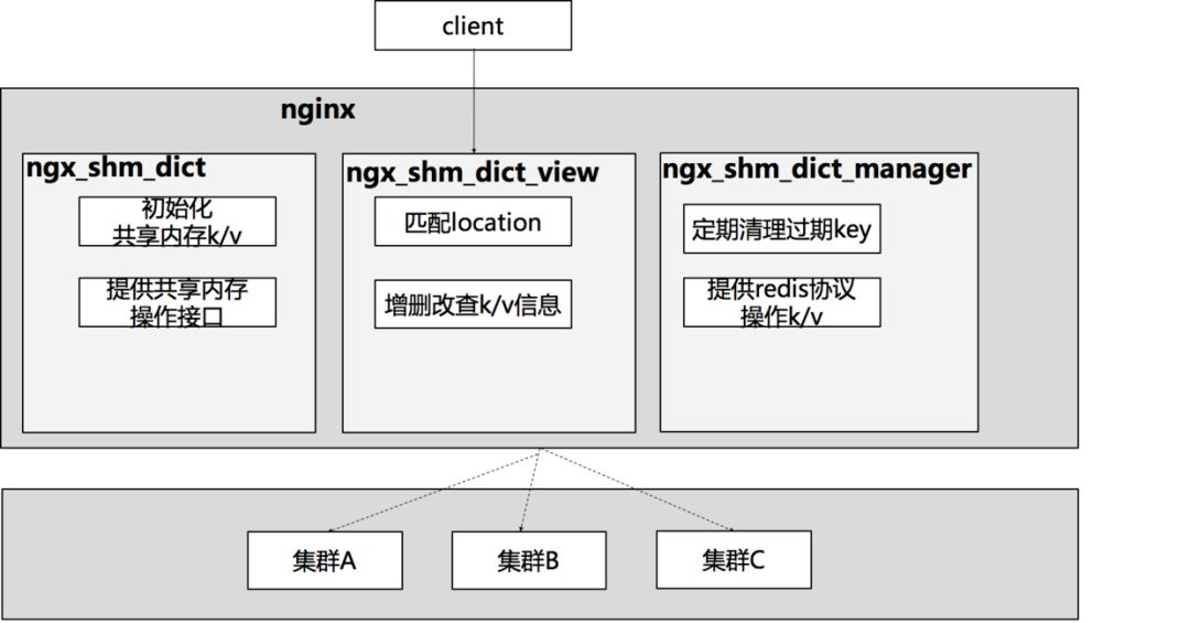 ngx_shm_dict:共享内存核心模块(红黑树,队列)ngx_shm_dict_manager:添加定时器事件,定时的清除共享内存中过期的 Key,添加读事件,支持 Redis 协议,通过 redis-cli get,set,del,ttl