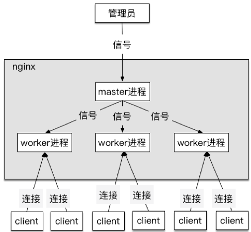 Master 进程:监视工作进程的状态;当工作进程死掉后重启一个新的;处理信号和通知工作进程。