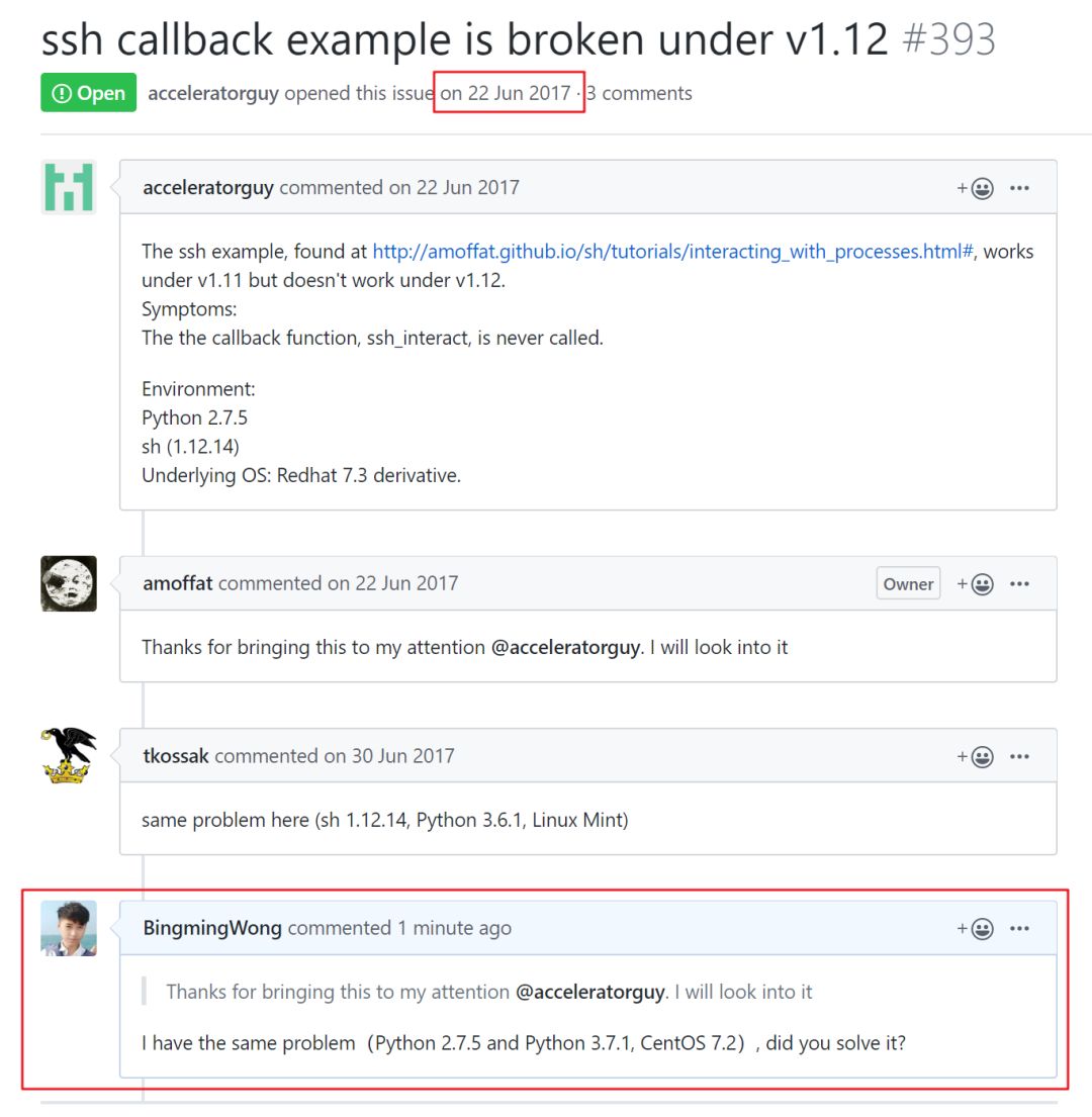 通过调试查看源代码,仍然查不到问题所在,于是去 Github 上搜了下,原来在 2017 年就已经存在这个问题了,到现在 2020 年了还没有修复,看来使用 sh.ssh