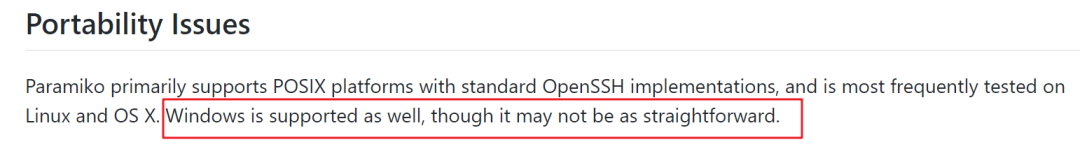 到这里,Paramiko 已经完胜了,但是仍然有一个痛点我们没有提及,就是多平台,说的就是 Windows,这里就有一件好事,一件坏事了,。