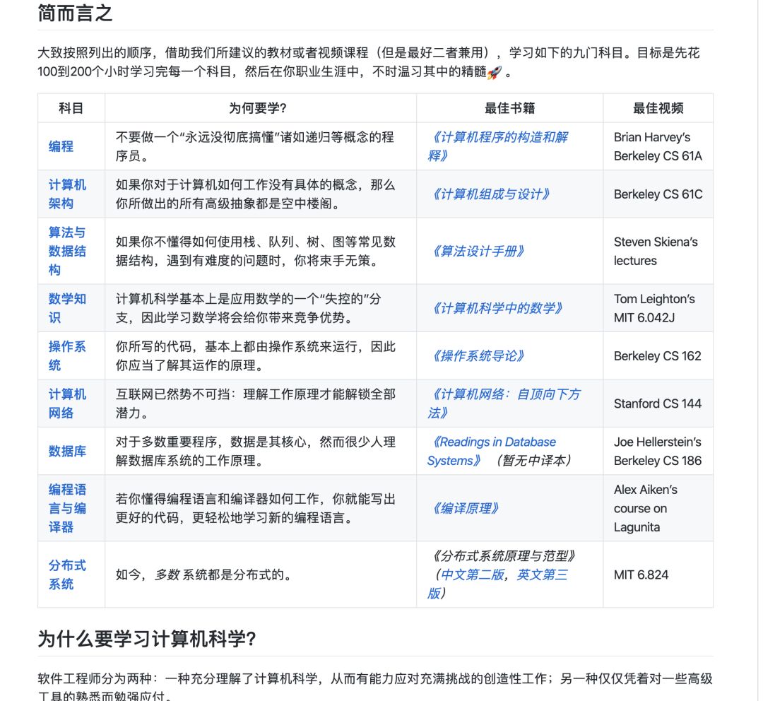 - 介绍:TeachYourselfCS 的中文翻译。内容超级棒!如果你是一个自学成才的工程师,或者从编程培训班毕业,那么你很有必要学习计算机科学。幸运的是,不必为此花上数年光阴和不菲费用去攻读一个学位:仅仅依靠自己,你就可以获得世界一流水平的教育。在这份指引中会为你解答:你应当学习「哪些科目」,为什么?对于这些科目,「最好的书籍或者视频课程」是什么?