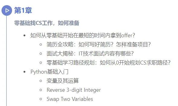 面向零基础想找工作的同学,课程很务实,面试中常考的Python语言、算法和数据结构都cover到了,包含基础知识 + 大厂真题讲解 + 面试经验传授+科学的课后练习。