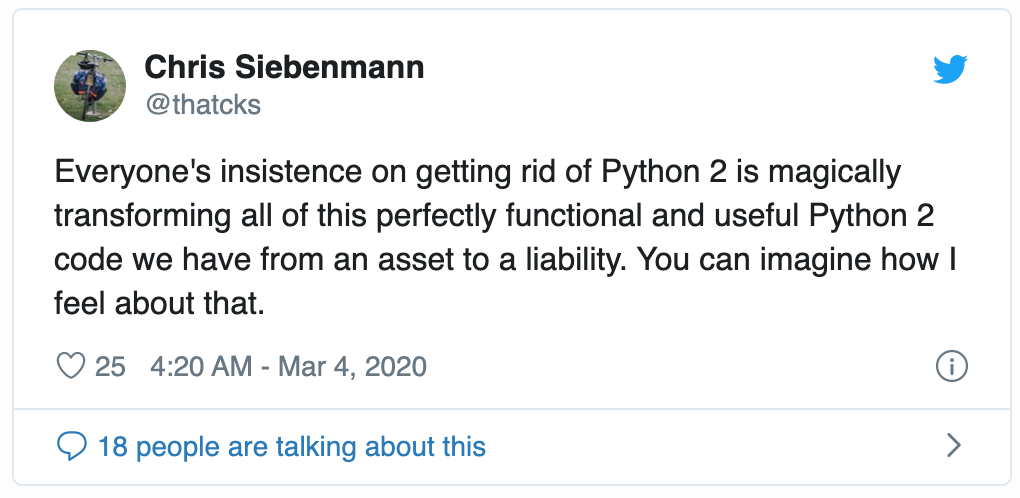 今年1月1日,Python 2代码库被冻结。从那天起,不再有Python 2进一步的向后移植(backport),实际上使这种语言及运行时环境成了过时的技术。核心开发人员Nick Coghlan在FAQ中解释道,因而结束了“核心开发团队为参考解释器同时维护Python 2和3长达约13年”的局面。Python 2的最终版现正通过beta测试版和发行候选版阶段,预计最后一个生产级版本Python 2.7.18会在2020年4月推出。虽然Python社区中的大多数人一致认为Python需要大刀阔斧的改动——尤其是由于迫切需要的、早就该有的统一码(Unicode)支持。但是Python 2代码运行得好好的许多人颇感沮丧。有关这种迁移的真实故事在网上比比皆是,领导迁移工作的开发人员更是有话要说。Chris Siebenmann上周巧妙地总结了一些挫折感,他的Twitter个人资料显示他是一名“过于投入的系统管理员”。Siebenmann在一篇博文中写道“没必要维护就可以运行的实用代码是一种资产;它就在那里,处理有价值的任务,不需要你做任何工作。为了不破坏系统(而不是添加任何功能)而必须做大量工作的代码是一种包袱;你得做一番工作,还引入了风险,却一无所获。”但是他的处境没有博得云/ AI架构师Phil Rhodes的多少同情,后者创办了Fogbeam Labs,这家公司生产开源企业软件,他在Hacker News网站上提出了相左的观点。“大约12年来,人们始终知道需要开始迁离Python 2。如果你现在因Python 2即将消失而感到恐慌,很难不问‘你之前在等什么?’”大公司同样面临迁移方面的挑战。LinkedIn的高级软件工程师Barry Warsaw还是自上世纪90年代中期以来的Python指导委员会成员和Python核心开发人员,他在博文中描述了“在完成大概两个季度的规划和两个季度的执行之后”,LinkedIn为完成代码库的迁移开展了旷日持久的“横跨多个季度的工作”。开发团队先在图上列出了诸依赖项以确定工作优先级——列出了75个“基础性”存储库,然后创建了内部库的“双语”版本(可以使用Python 2或Python 3)。Warsaw提到多个团队和部门的工作时写道:“这项工作需要共迁移约550个代码存储库(库、应用程序和服务)。”除了面向用户的服务外,LinkedIn还在内部使用Python用于持续集成/持续交付(CI/CD)框架、命令行接口以及部署和数据科学工具,这种散乱的非整体式环境用Warsaw的话来说“包括数百种独立的微服务和工具,外加几十个支持库,它们都归分管不同存储库的独立团队拥有。”但是并非所有人都感到很高心。1月份,开发人员Wayne Rowcliffe在Hacker News上发帖称其工作场所终于“快要完成迁移到Python 3的工作”。“这项工作的最终结果是,上周我花了很大一部分时间来审核有70000行代码变更的合并请求(pull request),这是去年秋天进来的大约1万行变更请求中的最后一个合并请求。这一切都是我一位同事的杰作,他那无人羡慕的任务是梳理我们的整个代码库,以确定‘这是统一码。这是字节。这是我们需要编码/解码的API边界’等等。”他在后来的评论中将策略归结为9个字。“我们运行了代码检查工具和测试套件,直到一切都过关。只是这时你面临100万行代码,要花不少的时间。”另一番批评来自旧金山的开发人员Gregory Szorc,他是Mercurial版本控制工具的维护者。Mercurial与Python社区关系密切——Python一直使用Mercurial作为其存储库,但在2016年改用了Git。不过Szorc在一篇博文中描述了Mercurial在2019年11月5日努力获得Python 3支持时所得到的体会,他对来自Python语言内部的瓶颈提出了一番批评。