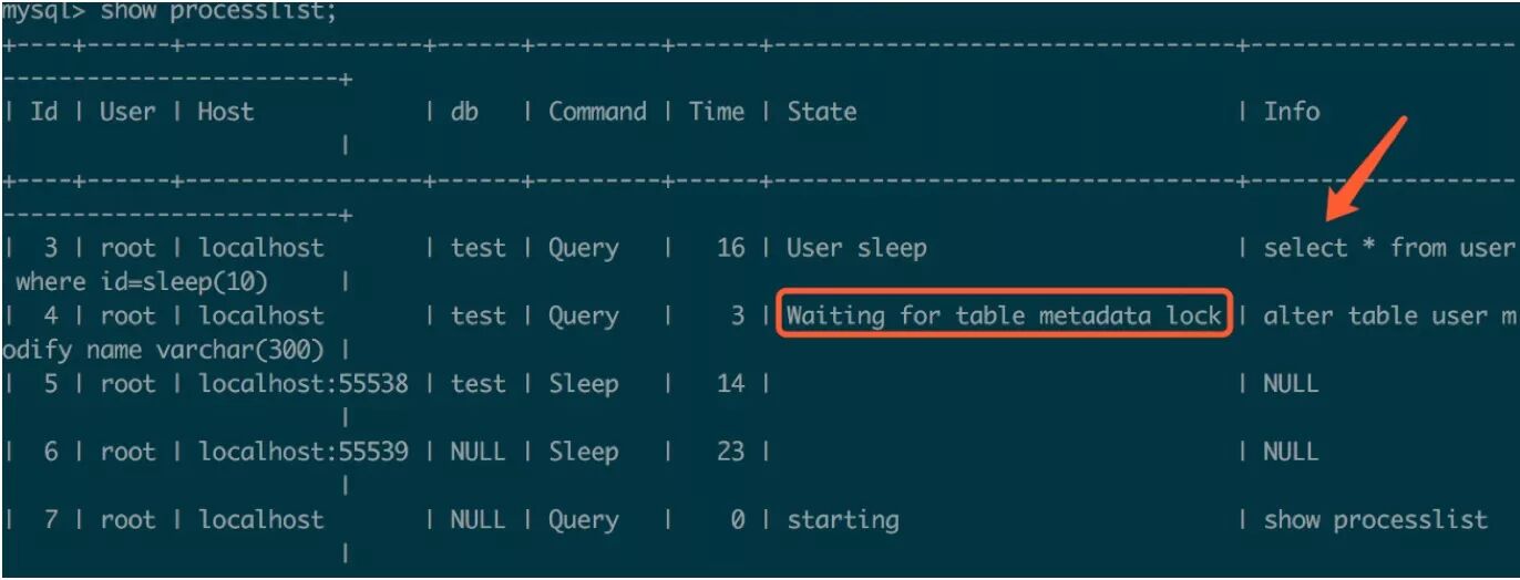 从进程可以看出alter语句在等待一个元数据锁,而这个元数据锁很可能是上面这条select语句引起的,事实正是如此。在执行DML(select、update、delete、insert)操作时,会对表增加一个元数据锁,这个元数据锁是为了保证在查询期间表结构不会被修改,因此上面的alter语句会被阻塞。那么如果执行顺序相反,先执行alter语句,再执行DML语句呢?DML语句会被阻塞吗?例如我正在线上环境修改表结构,线上的DML语句会被阻塞吗?答案是:不确定。