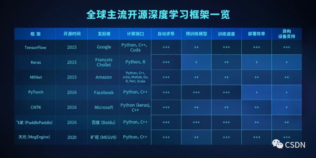人工智能(AI)自1956年的Dartmouth学会上被提出后,经过了一甲子有余的风雨沉浮发展。得益于自2013年以来深度学习技术取得突破性进展,人工智能出现了当下的一波繁荣浪潮。2016年3月,AlphaGo与围棋世界冠军职业九段棋手李世石进行了一场世纪围棋对决,AlphaGo以4:1的比分获胜。让深度学习以惊雷般地速度进入所有人的视野中。深度学习框架作为起到支撑作用的平台,是进行人工智能创造的框架,被所有企业所重视作为基础设施建设。相较于最开始学术机构提出的 Theano、Caffe 框架,深度学习框架的主流已经从学术机构转向了科技巨头,如Google的TensorFlow、Facebook的PyTorch 、Amazon的MXNet等。这些底层框架,让人工智能创造变得简单可执行。拥有自己的深度学习框架,毫无疑问是互联网巨头及人工智能独角兽科技企业们跨入战场的入场券。