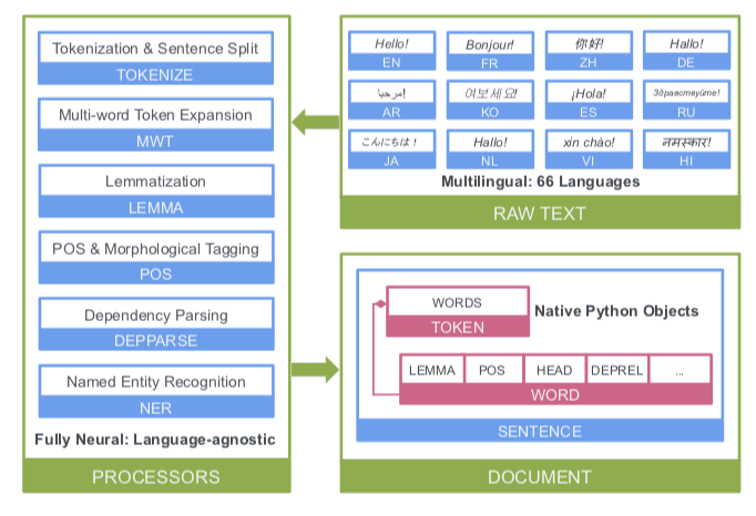 如果使用了 predicted,训练后的标记器模型会首先在训练/开发数据上运行以便生成预测的标记。 默认情况下,模型文件将在训练期间保存到 save_models 目录(也可以使用 save_dir 参数进行更改)。Stanza 的论文提供了整个代码库的架构。可以看到,它以原始文本为输入,能够直接输出结构化的结果。Stanza 的神经网络部分架构。除了神经网络 pipeline 以外,Stanza 也有一个 Python 客户端界面,和 Java 版的 Stanford CoreNLP 进行交互。