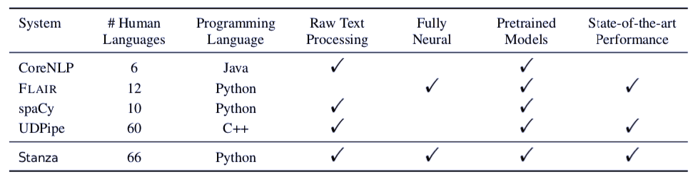 于此同时,论文还将 Stanza 和现有的 NLP 工具,如 spaCy 等进行了对比。可以看到,Stanza 是目前涵盖语言数量最多,达到 SOTA 且完全基于神经网络框架的库。最后,研究者还将 Stanza 上 NLP 任务的性能和现有的基线进行对比,发现 Stanza 大部分情况下都超过了 SOTA。和已有基线性能的对比。可以看到,Stanza 在多个语言多个任务中都实现了 SOTA。https://arxiv.org/abs/2003.07082—完—