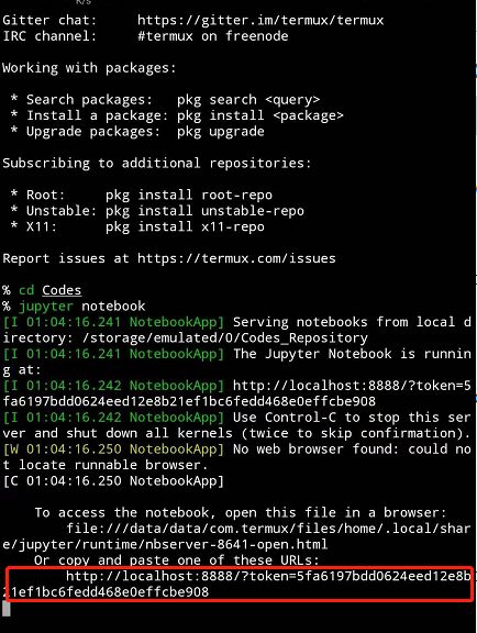 成功启动jupyter notebook后,会在命令行生成一个带token的url,复制它到你的手机浏览器上,现在在你的手机上好好练习代码吧…