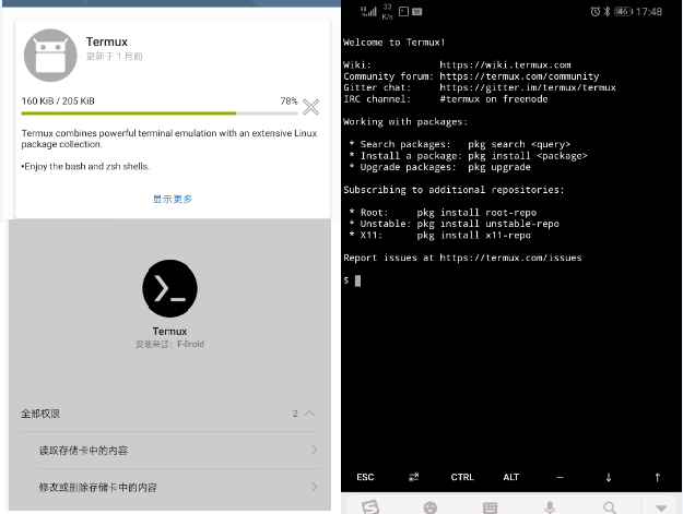 Termux的Wiki官网中可以看到推荐的下载方式是Google Play 和F-Droid。Google Play在手机上安装太麻烦了,所以推荐F-Droid,虽然它比较慢…当然你可以离线下载Termux的apk文件,虽然这样没办法获取更新。安装果果橙比较简单,下载F-Droid,完成安装后搜索Termux,下载即可。