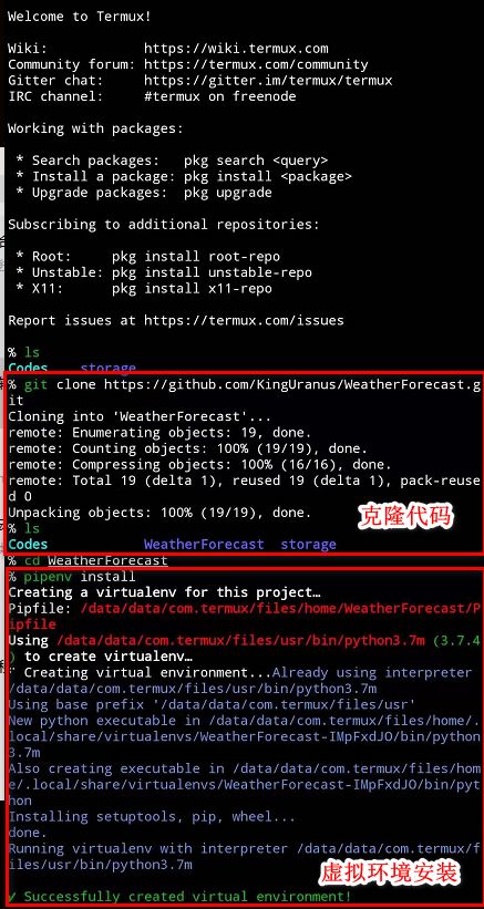 现在我们从手机上下载代码,进行安装… 1# 如果为安装pipenv,需要先进行安装操作