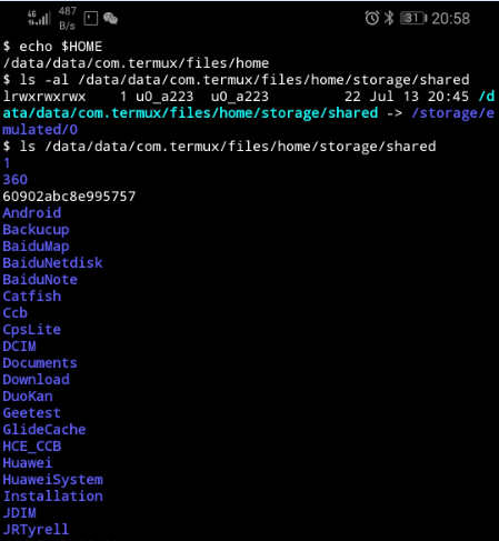 了解Linux的朋友应该比较清楚创建链接与挂载点的问题,手机的目录在Termux的/data/data/com.termux/files/home/storage/shared内。那么同样的,我们可以将手机的代码目录映射到Termux中。命令如下: