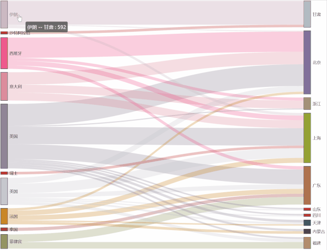 这张图既能看到所有来源国和输入地,还能看出每一个数据流动的起点和终点,这就是桑基图,展现数据流动的小能手。