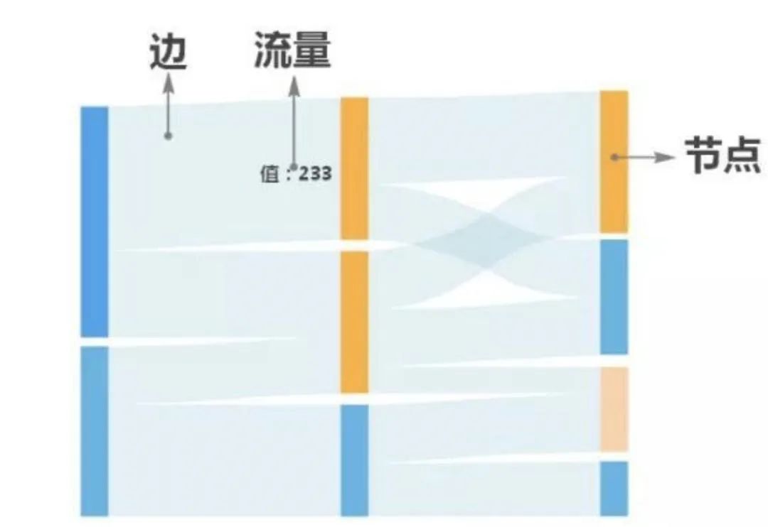 桑基图属于流程图的一种,核心在于展示数据的流转。大家是不是想到漏斗图?漏斗图是有转化流失,而桑基图只是流转,无论怎么流动,开端和末端数据总是一致的,这是他们之间的区别。