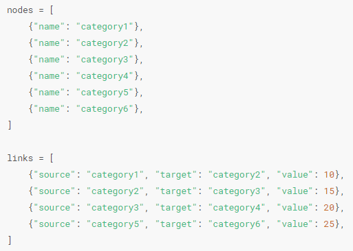 桑基图在pyecharts中通过Sankey方法实现,要求绘制桑基图的数据是这样的,字典格式。