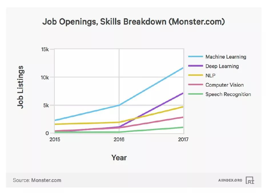 在线求职平台Monster.com上数据显示,机器学习,深度学习和自然语言处理(NLP)是最重要的三项技能。两年前NLP已经被预测会成为应用程序开发人员创建新的AI应用程序最需要的技能。除了创建AI应用程序,最受欢迎的技能还包括机器学习技术,Python,Java,C ++,开源开发环境的经验,Spark,MATLAB和Hadoop。根据对Monster.com的分析,在美国,数据科学家,高级数据科学家,人工智能顾问和机器学习主管的薪水中位数为$127000。