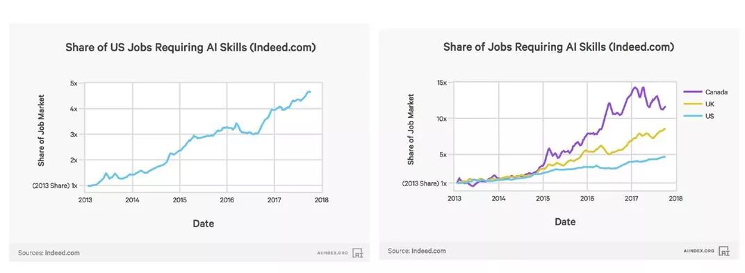 自2013年以来,要求有AI技能的工作岗位增长了4.5倍。在Indeed.com平台上,需要AI技能的工作岗位所占份额的计算方法是通过职业描述中的标题和关键字来确定是否与人工智能相关。AI Index研究还计算了在Indeed.com平台上,要求人工智能技术的工作岗位份额在不同国家的增长情况。尽管加拿大和英国增长迅速,但对于人才招聘市场, Indeed.com的报告显示加拿大和英国分别只占美国AI招聘市场绝对规模的5%和27%。