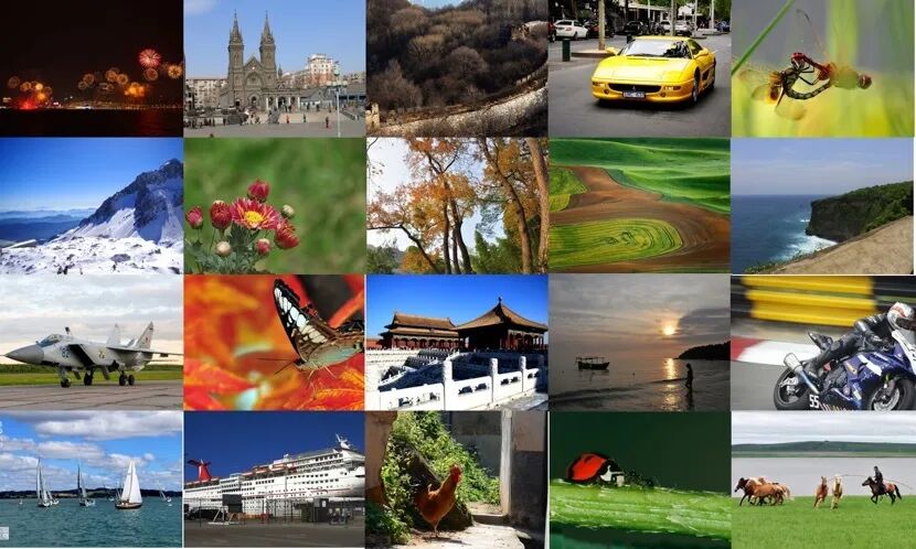 基于此,我们选择了GHIM-10k数据集,这是一个图像检索数据集,包含20个类别,分别是日落,船舶,花卉,建筑物,汽车,山脉,昆虫等自然图像,各个类别拥有较好的多样性,而类别之间也有比较好的区分度。数据集共10000张图像,每个类别包含500张JPEG格式的大小为400×300或300×400的图像。