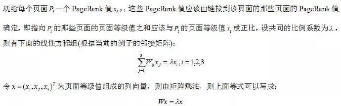PageRank算法的具体实现可以利用网页所对应的图的邻接矩阵来表达超链接关系。因此要先写出所对应图的邻接矩阵 A ,为了能将网页的页面等级值平均分配给该网页所链接指向的网页,需要对各个行向量进行归一化处理,得到矩阵A1。PageRank算法的矩阵是将归一化矩阵A1转置所得矩阵W,称之为 转移概率矩阵(是不是和马尔可夫链有点像,的确是与马尔可夫链过程有着密切的关系),其特征是各个列列向量之和为全概率1,各个行矢量表示状态之间的转移概率,转置的原因是PageRank算法重视的某个页面被多少个页面链接,而不是链接到多少个页面。各个网页的页面等级制就是求这个转义概率矩阵W的最大特征值所属的特征向量。因此可以看出,PageRank的应用也主要是对某些过程对象进行重要等级排名。