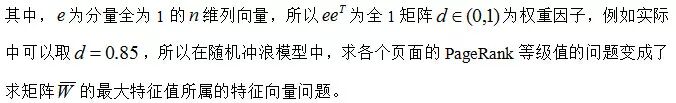 随机冲浪模型(Random Surfer Model)是为了更加的符合实际情况而对上述PageRank基本模型进行的改进。PageRank算法原理中假设所有的网页形成一个闭合的链接图,除了这些文档以外没有其他任何链接的出入,并且每个网页能从其他网页通过超链接达到.但是在现实的网络中,并不完全是这样的情况.当一个页面没有出链的时候,它的PageRank值就不能被分配给其它的页面。同样道理,只有出链接而没有入链接的页面也是存在的。但PageRank并不考虑这样的页面.在现实中的页面,无论怎样顺着链接前进,仅仅顺着链接是绝对不能进入的页面群总归是存在的。所以为了解决这个问题,提出了用户的随机冲浪模型:用户虽然在大多数情况下都顺着当前页面中的链接前进,但也有少数情况会突然重新打开浏览器随机进入到完全无关的页面。这样就可以用公式表示相应的概率矩阵: