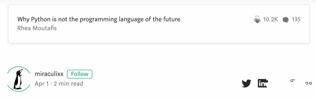 一位名叫Rhea Moutafis的网友认为,Python不会是“未来的编程语言”。观点仅发布数日,便得到了10.2k的点赞。