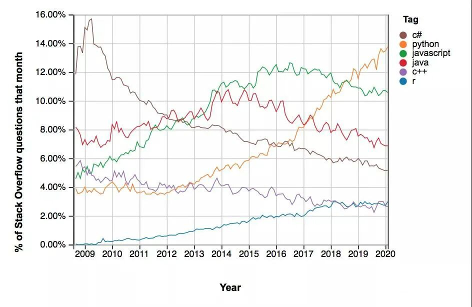 而在所有Stack Overflow的问题中,几乎有14%的问题被贴上了 “Python “的标签,而且这个趋势还在上升。