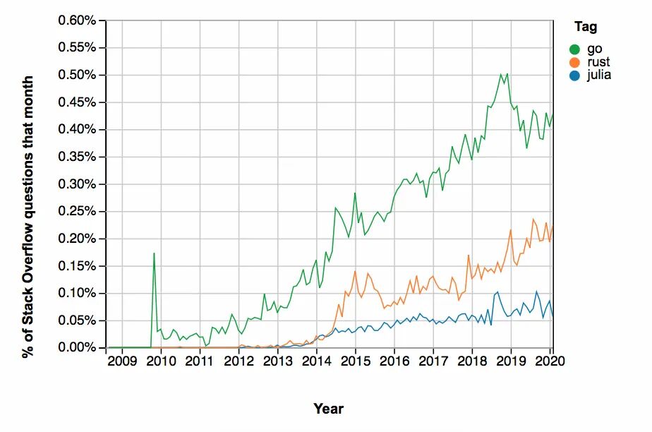 所有这些语言都擅长于未来的技术,尤其是人工智能。虽然它们的市场份额仍然很小,但从StackOverflow标签的数量可以看出,它们上升的趋势都很明显。