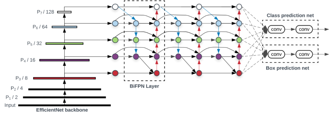 目前,该项目在 GitHub 上获得了 957 颗星,最近一天的收藏量接近 300。GitHub 地址:https://github.com/zylo117近年来,在面对广泛的资源约束时(如 3B 到 300B FLOPS),构建兼具准确率和效率的可扩展检测架构成为优化目标检测器的重要问题。基于单阶段检测器范式,谷歌大脑团队的研究者查看了主干网络、特征融合和边界框/类别预测网络的设计选择,发现了两大主要挑战并提出了相应的解决方法:挑战 1:高效的多尺度特征融合。研究者提出一种简单高效的加权双向特征金字塔网络(BiFPN),该模型引入了可学习的权重来学习不同输入特征的重要性,同时重复应用自上而下和自下而上的多尺度特征融合。挑战 2:模型缩放。受近期研究的启发,研究者提出一种目标检测器复合缩放方法,即统一扩大所有主干网络、特征网络、边界框/类别预测网络的分辨率/深度/宽度。谷歌大脑团队的研究者发现,EfficientNets 的效率超过之前常用的主干网络。于是研究者将 EfficientNet 主干网络和 BiFPN、复合缩放结合起来,开发出新型目标检测器 EfficientDet,其准确率优于之前的目标检测器,同时参数量和 FLOPS 比它们少了一个数量级。下图展示了 EfficientDet 的整体架构,大致遵循单阶段检测器范式。谷歌大脑团队的研究者将在 ImageNet 数据集上预训练的 EfficientNet 作为主干网络,将 BiFPN 作为特征网络,接受来自主干网络的 level 3-7 特征 {P3, P4, P5, P6, P7},并重复应用自上而下和自下而上的双向特征融合。然后将融合后的特征输入边界框/类别预测网络,分别输出目标类别和边界框预测结果。下图展示了多个模型在 COCO 数据集上的性能对比情况。在类似的准确率限制下,EfficientDet 的 FLOPS 仅为 YOLOv3 的 1/28、RetinaNet 的 1/30、NASFPN 的 1/19,所有数字均为单个模型在单一尺度下所得。可以看到,EfficientDet 的计算量较其他检测器少,但准确率优于后者,其中 EfficientDet-D7 获得了当前最优性能。