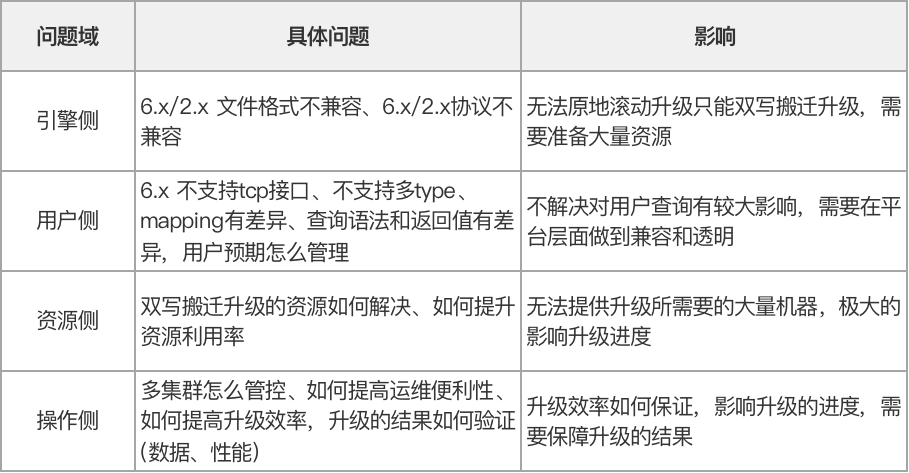 在刚开始决定进行跨版本升级之后,我们面临的问题就扑面而来,其中任何一条不解决,都会极大的阻碍升级的进程。