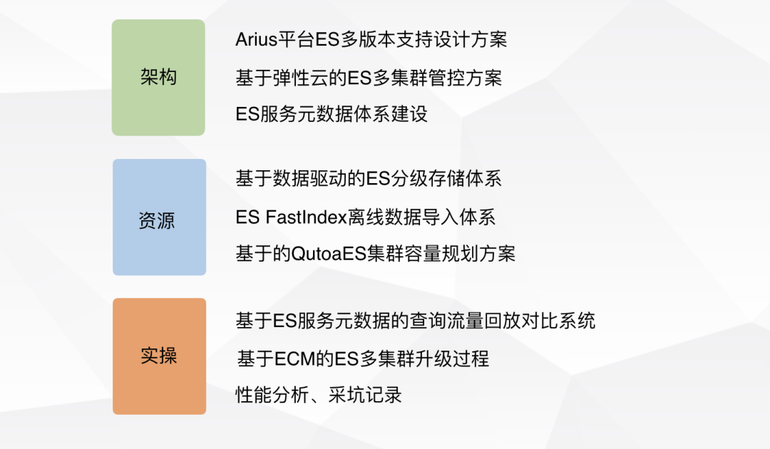具体包括:索引存储周期优化、冷热数据分离、Mapping 优化、fastIndex 等,具体见后续详细说明。