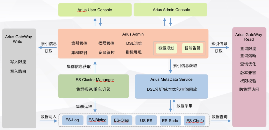 Arius Admin 负责索引、权限、资源管控等核心能力。依赖 Admin 的核心能力以及 AMS 的数据采集能力,还提供了容量规划和智能告警两个设计良好并且可插拔的扩展服务。