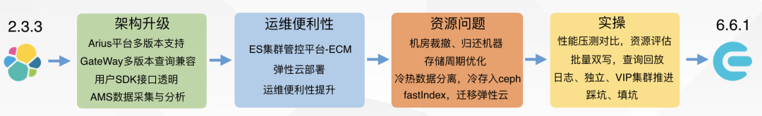 如此大规模的跨大版本升级,在 ES 业内也很少见,从开始准备到实际执行,遇到了很多困难,踩了一些坑,期间也有很多我们的思考。