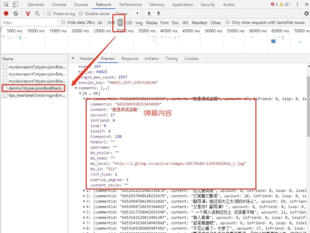 我们使用谷歌浏览器,右键审查元素,观察Network的请求,播放开始后出现了大量请求,我们在js选项下发现了一个比较特殊的请求 "danmu" ,打开这个请求后发现这就是我们要的弹幕数据。