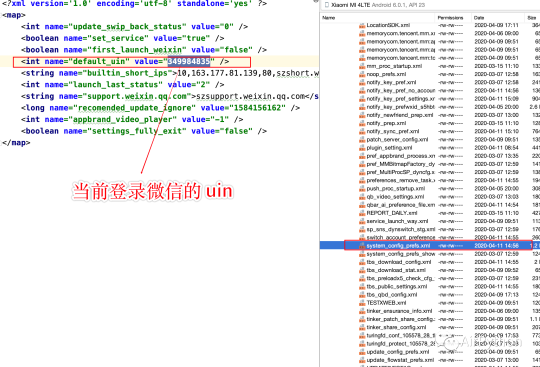微信的 UIN 在下面配置文件中,找到 name 属性为 default_uin 的 value 值,即为 UIN