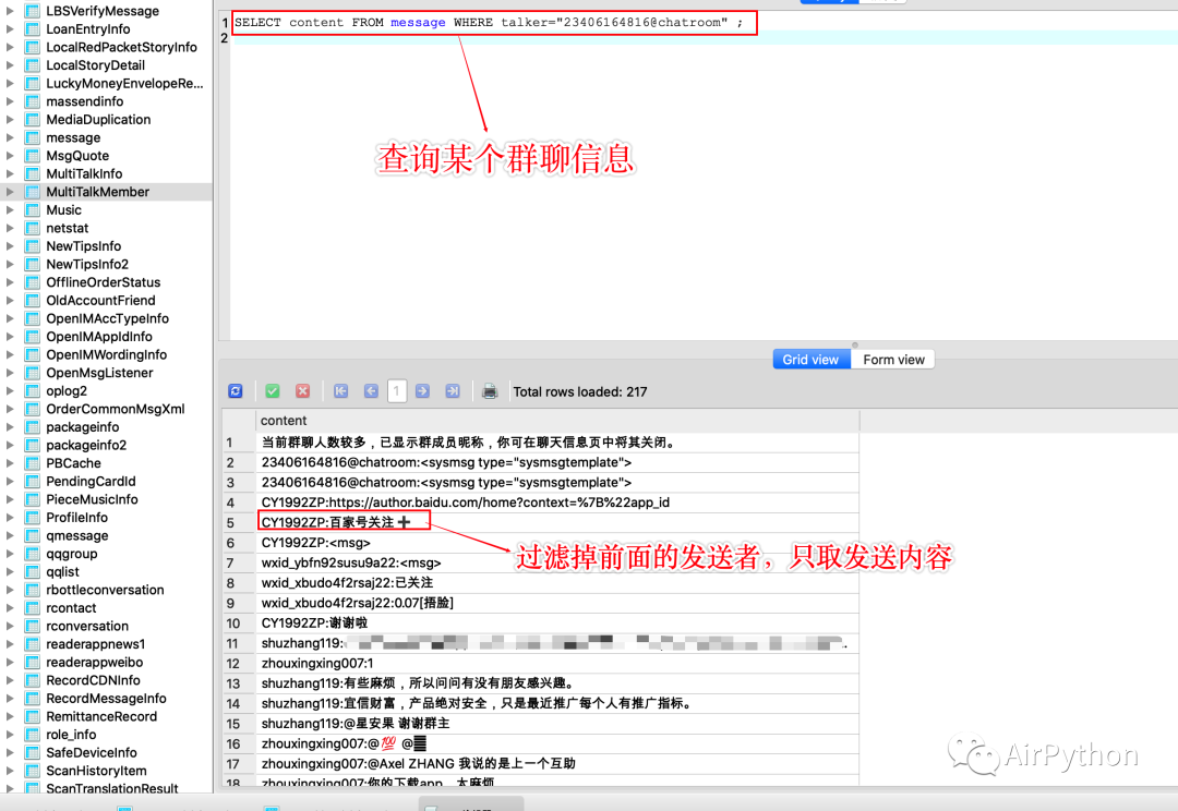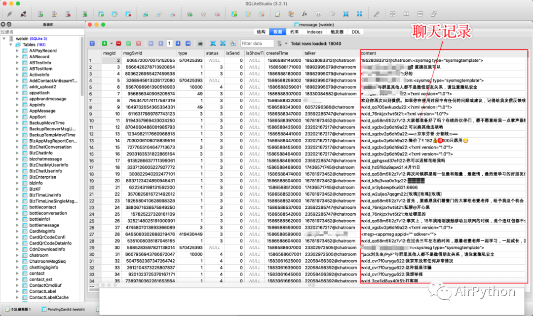 微信所有的文字聊天记录都存放在 mesage 数据表中,包含:聊天内容、发送者、消息类型、创建时间等