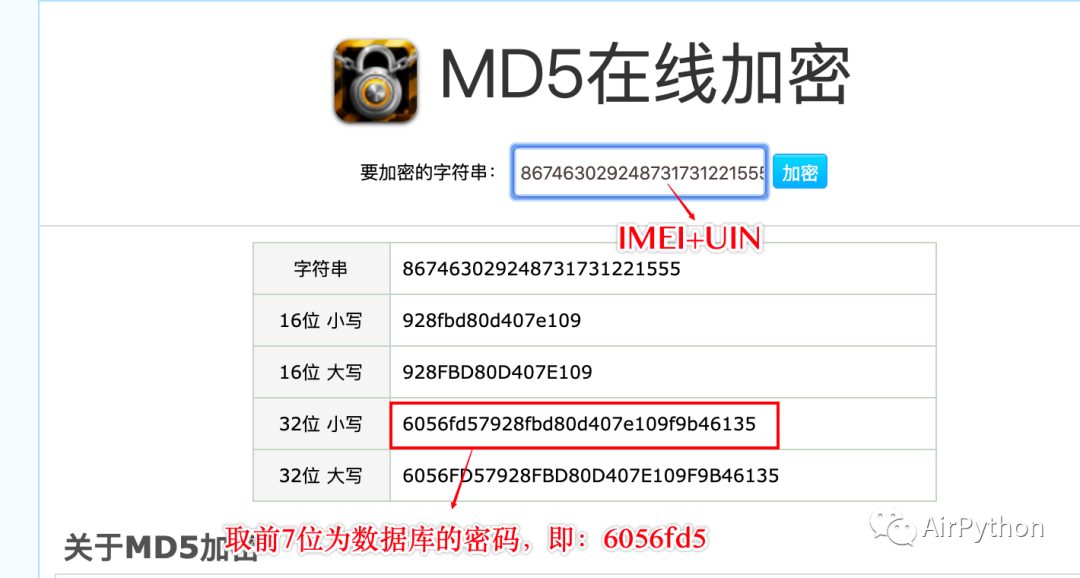 最后,然后将 IMET 和 UIN 组成字符串,然后利用 MD5 进行加密,取 32 位小写的前 7 位即为微信数据库的密码。