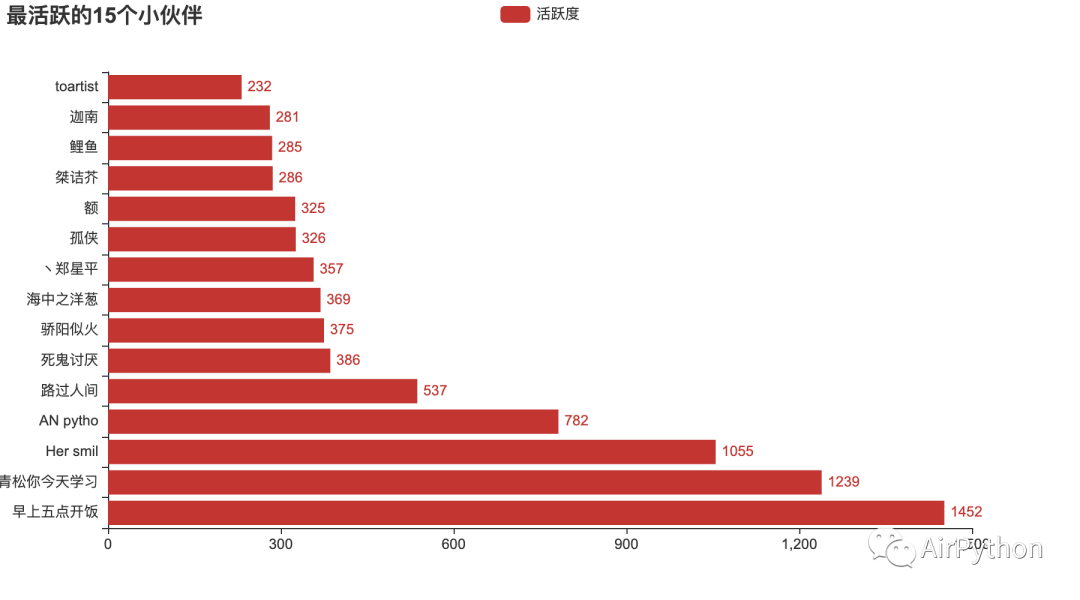 上面的操作,通过生成的词云了解到当前群聊过去一段时间都在聊的话题及价值,通过对聊天记录的数据分析,获取到微信群聊活跃度排名。