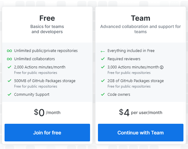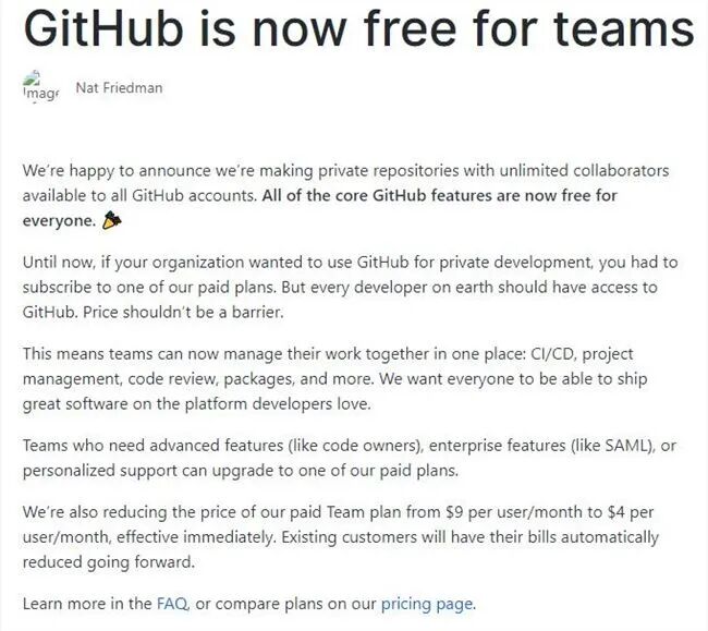 总而言之,就是之前Github仅仅是私有仓库对个人免费,而现在对所有账号开放(包括团队),并且取消了协作者的数量限制。这都是因为Github希望每个人都能在开发者喜欢的平台上发布优秀的软件。同时收费服务的费用也下调,比如Code Owners、SAML这类高级功能的费用较之前都有所下降。本周早些时候,GitHub首席执行官Nat Friedman强调称,此举并不是针对新冠疫情而推出的促销项目。