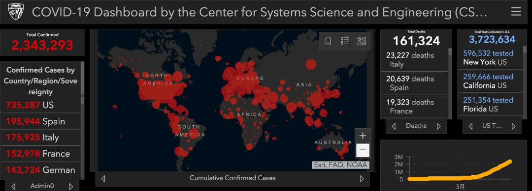但同时全球疫情十分严峻, 根据美国约翰斯.霍普金斯大学统计的数据显示,截至北京时间19日晚6时38分,全球新冠死亡病例超过16万例,达到161,324例,全球确诊病例突破230万,达2,343,293例。
