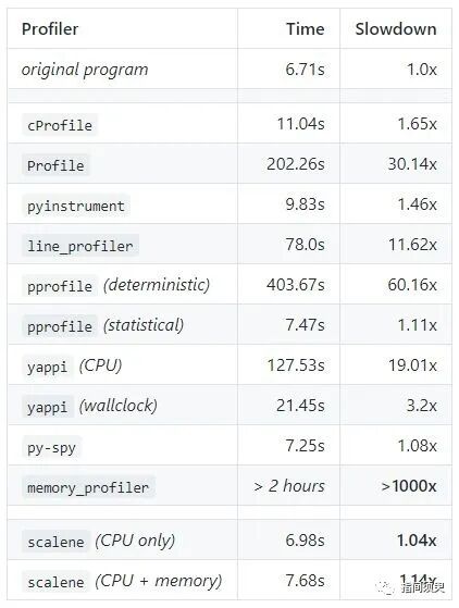 % python3 -m scalene --help usage: scalene [-h] [-o OUTFILE] [--profile-interval PROFILE_INTERVAL] [--wallclock] prog Scalene: a high-precision CPU and memory profiler. https://github.com/emeryberger/Scalene for CPU profiling only: % python -m scalene yourprogram.py for CPU and memory profiling (Mac OS X): % DYLD_INSERT_LIBRARIES=$PWD/libscalene.dylib PYTHONMALLOC=malloc python -m scalene yourprogram.py for CPU and memory profiling (Linux): % LD_PRELOAD=$PWD/libscalene.so PYTHONMALLOC=malloc python -m scalene yourprogram.py positional arguments: prog program to be profiled optional arguments: -h, --help show this help message and exit -o OUTFILE, --outfile OUTFILE file to hold profiler output (default: stdout) --profile-interval PROFILE_INTERVAL output profiles every so many seconds. --wallclock use wall clock time (default: virtual time)对比其他分析器 性能和功能 下面的表格把 scalene 和不同分析器的性能 做了比较。运行的示例程序 (benchmarks/julia1_nopil.py) 来自于 Gorelick 和 Ozsvald 的 《高性能Python编程》 。所有的这些结果都是在 2016款 MacBook Pro上运行的。