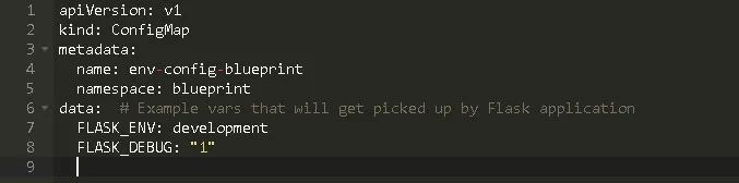 在这里,为应用程序定义诸多变量。其中字段‘data:’的值将作为应用程序在容器中的环境变量。上面的例子中,FLASK_ENV和FLASK_DEBUG等诸多变量将在应用程序启动时由Flask自动获取。