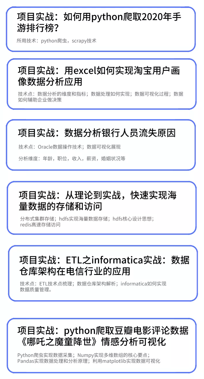 与市面上的其它资料不同,该课程主要以实战胜理论,以真诚胜套路,立足于企业实战,项目来源都是 BATH 等国内一线大厂企业,真实的业务数据,真实的业务背景,提供与大厂零距离的技术和实战能力。