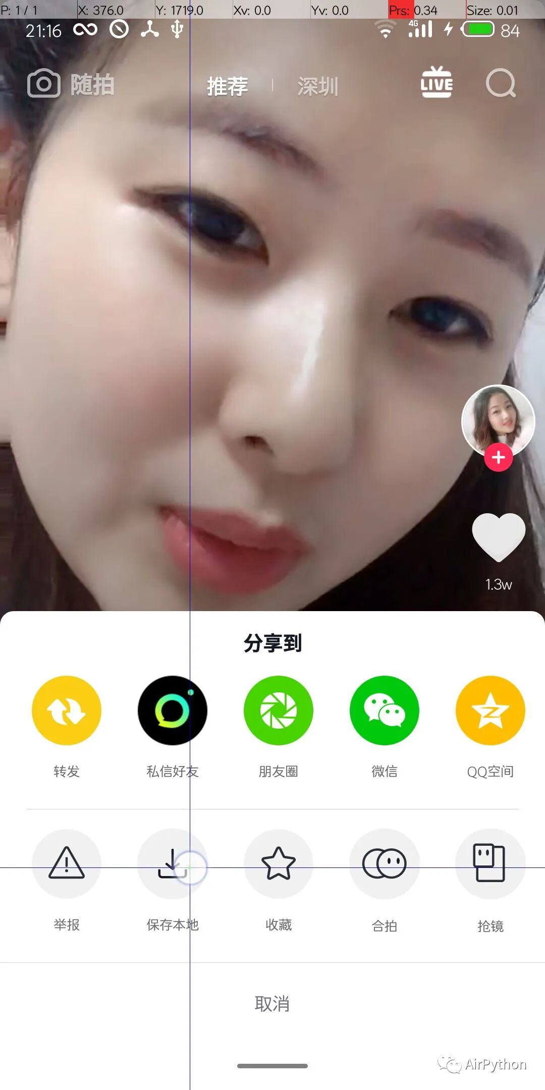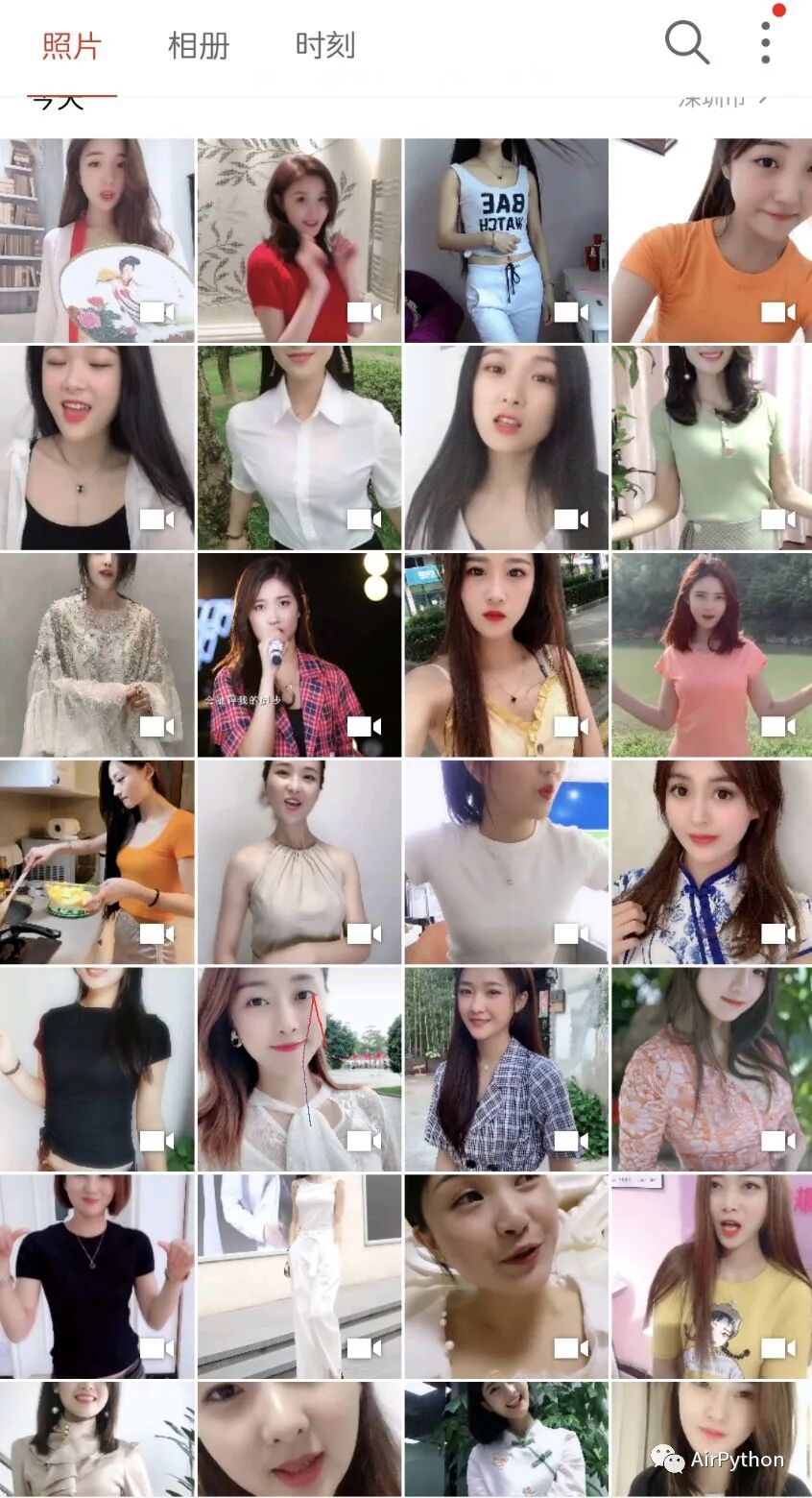 运行上面的脚本,会自动打开抖音,对每一条小视频多次进行人脸识别,直到识别到颜值高的小姐姐,保存视频到本地,然后继续刷下一条短视频。