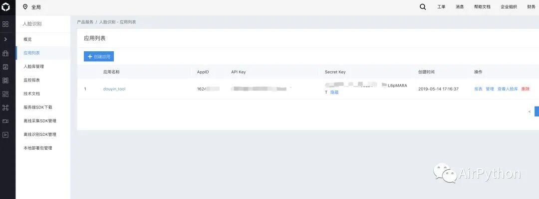 这里需要进行百度云后台,注册一个人脸识别的应用,获取到一组 「API Key 和 Secret Key」值。