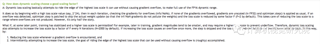 判断你的GPU是否支持FP16:构拥有Tensor Core的GPU(2080Ti、Titan、Tesla等),不支持的(Pascal系列)就不建议折腾了。 常数的范围:为了保证计算不溢出,首先要保证人为设定的常数(包括调用的源码中的)不溢出,如各种epsilon,INF等。 Dimension最好是8的倍数:Nvidia官方的文档的2.2条表示,维度都是8的倍数的时候,性能最好。 涉及到sum的操作要小心,很容易溢出,类似Softmax的操作建议用官方API,并定义成layer写在模型初始化里。 模型书写要规范:自定义的Layer写在模型初始化函数里,graph计算写在forward里。 某些不常用的函数,在使用前需要注册:amp.register_float_function(torch, 'sigmoid') 某些函数(如einsum)暂不支持FP16加速,建议不要用的太heavy,xlnet的实现改FP16困扰了我很久。 需要操作模型参数的模块(类似EMA),要使用AMP封装后的model。 需要操作梯度的模块必须在optimizer的step里,不然AMP不能判断grad是否为Nan。 这篇从理论到实践地介绍了混合精度计算以及Apex新API(AMP)的使用方法。现在在做深度学习模型的时候,几乎都会第一时间把代码改成混合精度训练的了,速度快,精度还不减,确实是调参炼丹必备神器。目前网上还并没有看到关于AMP以及使用时会遇到的坑的中文博客,所以这一篇也是希望大家在使用的时候可以少花一点时间debug。 如果想加入我们“ 计算机视觉研究院 ”,请扫二维码加入我们。我们会按照你的需求将你拉入对应的学习群! 计算机视觉研究院 主要涉及 深度学习 领域,主要致力于 人脸检测、人脸识别,多目标检测、目标跟踪、图像分割等 研究方向。研究院 接下来会不断分享最新的论文算法新框架,我们这次改革不同点就是,我们要着重” 研究 “。之后我们会针对相应领域分享实践过程,让大家真正体会 摆脱理论 的真实场景,培养爱动手编程爱动脑思考的习惯!